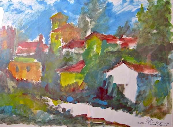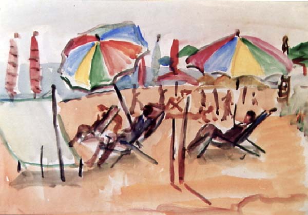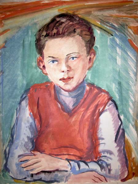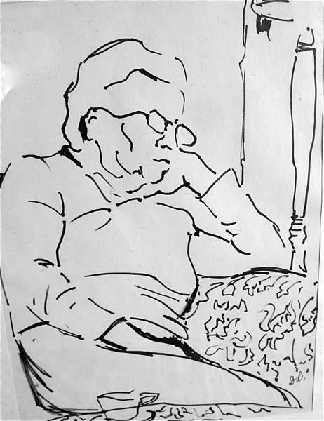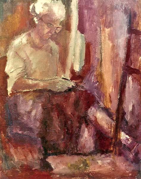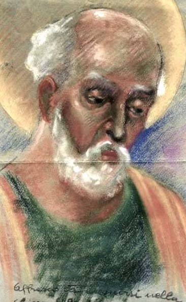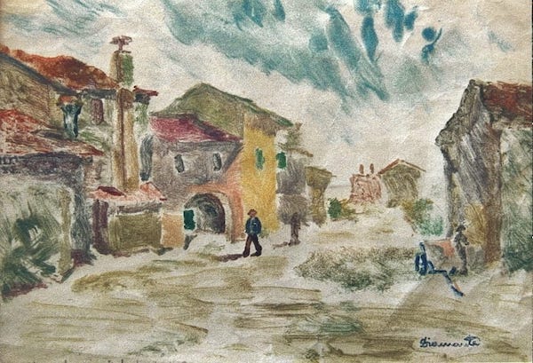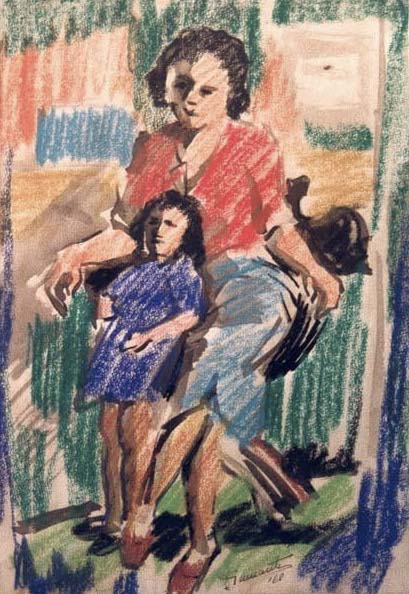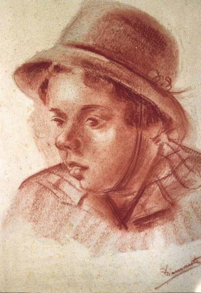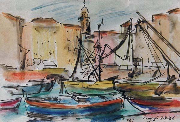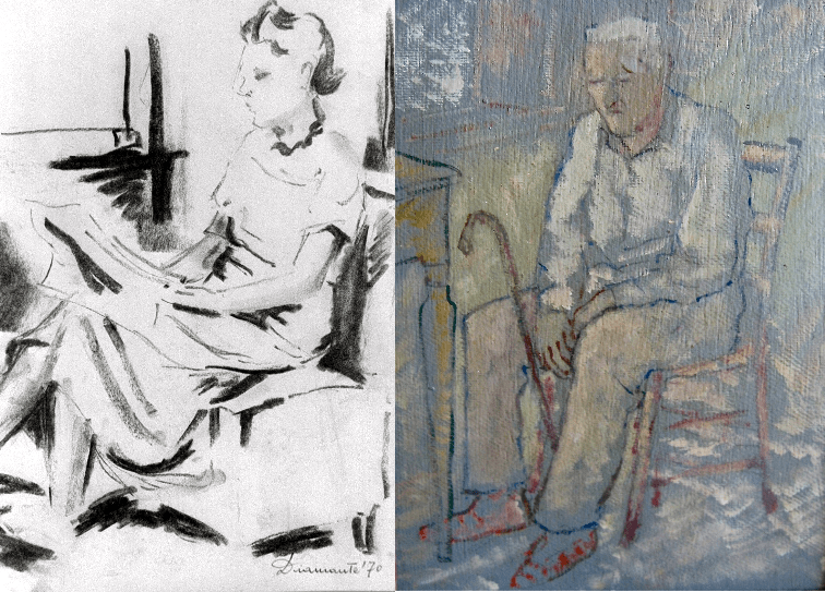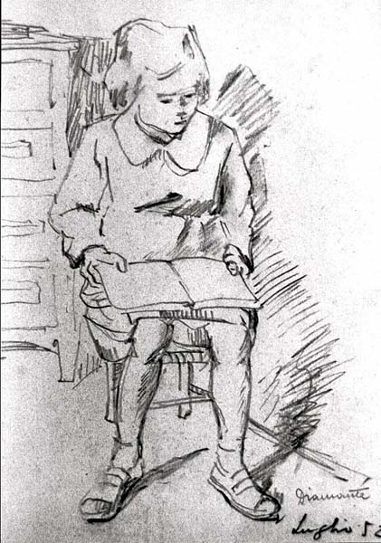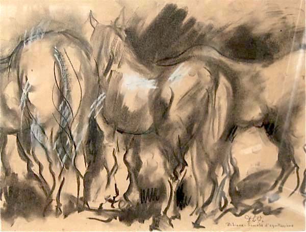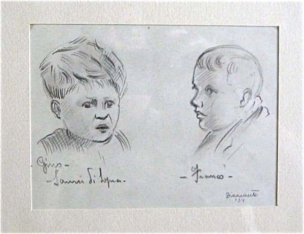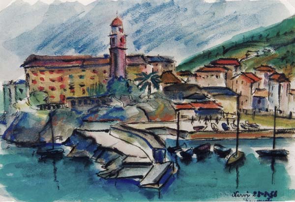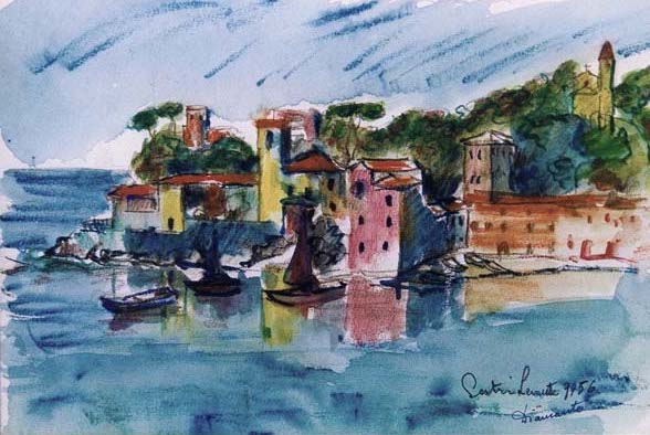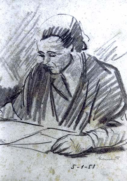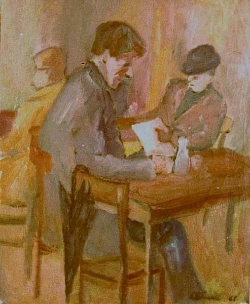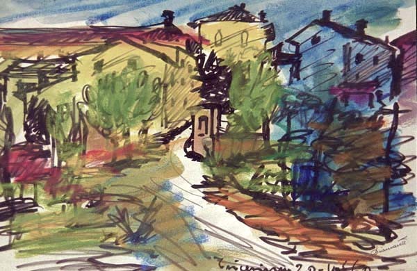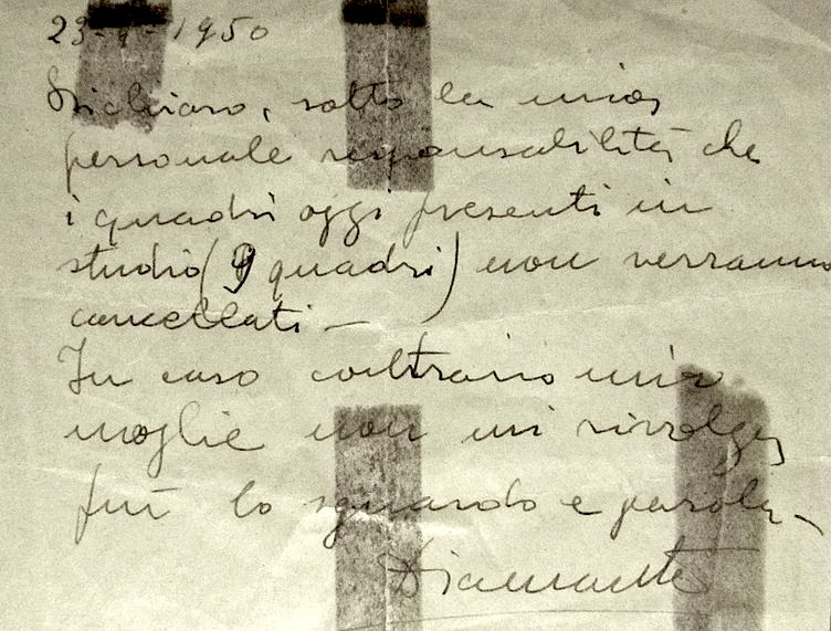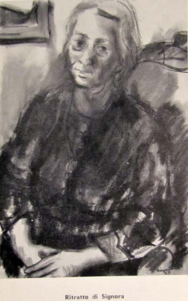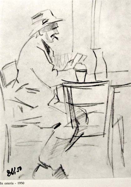 La moglie, Vittorina, lo ha sempre seguito nel suo lavoro; spesso lo invitava (con scarso successo) a non eliminare, ridipingendo ad olio, opere precedenti. Un giorno arrivò a chiedergli una dichiarazione scritta. L’accontentò. Ma posso testimoniare che negli anni seguenti in cui vissi con loro quell’impegno fu più volte disatteso da mio zio… . E la zia continuò a rivolgergli la parola… V.V.