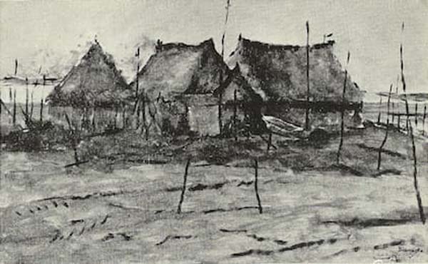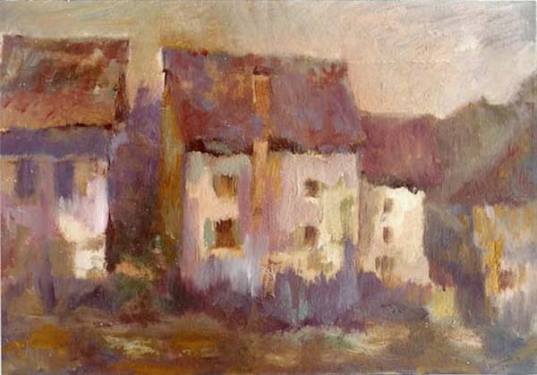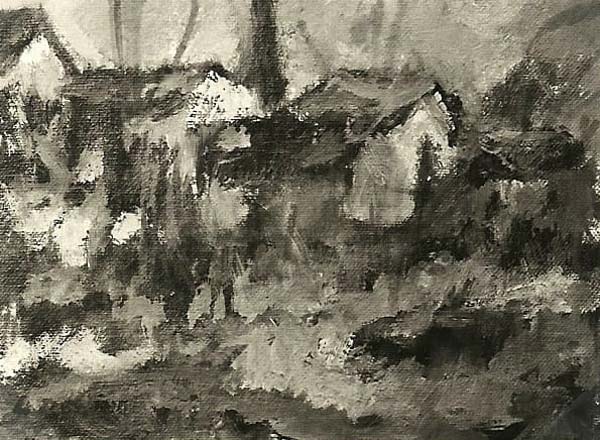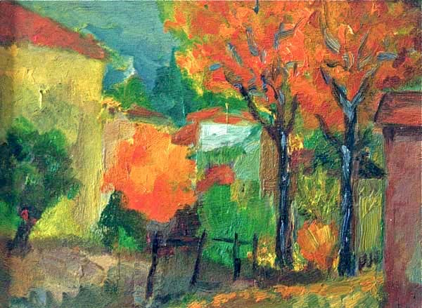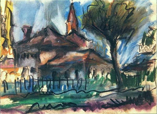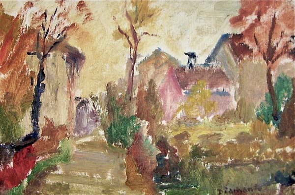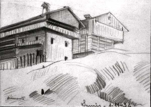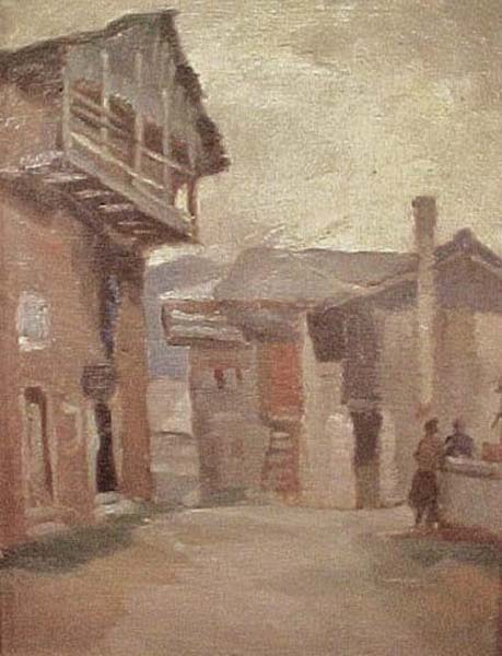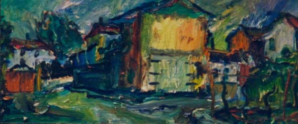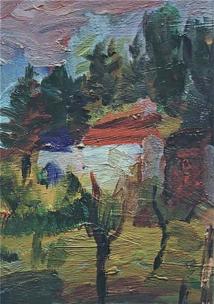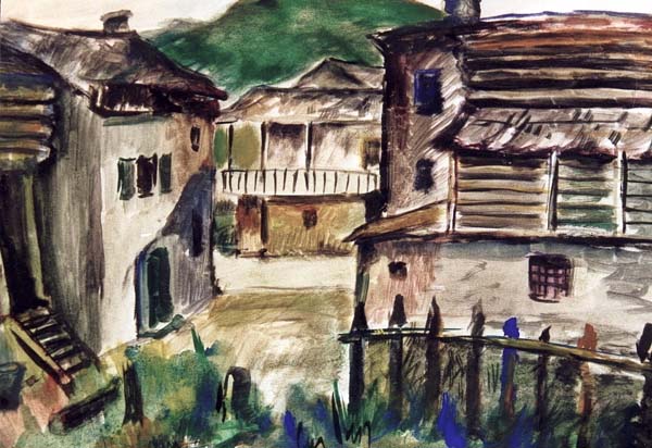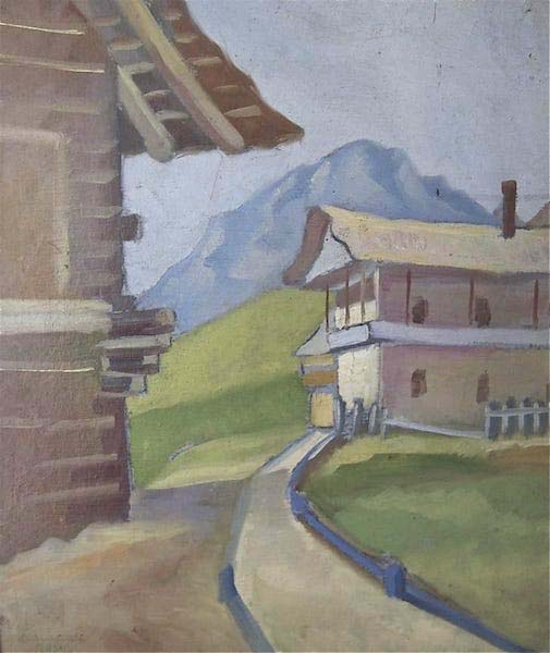 Sulla sinistra, in primo piano, una baita di legno, della quale si scorge solo uno spigolo e l’angolo del tetto: colta in controluce, spicca fortemente, col suo marrone scuro, sulle tinte più tenui del secondo piano. Al centro, una stradina che taglia per i prati, in una prevalente tonalità color ocra e marroncino: la stagione, dunque, è autunnale. Sulla destra, una casa a due piani rappresentata quasi per intero, con il duplice tetto spiovente, con il cancelletto di legno e le piccole finestre, e con l’alto camino che pare il fumaiolo d’una nave a vapore.