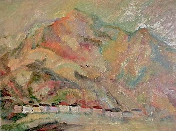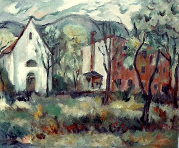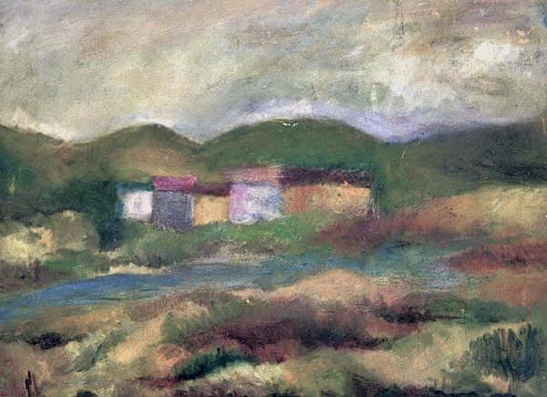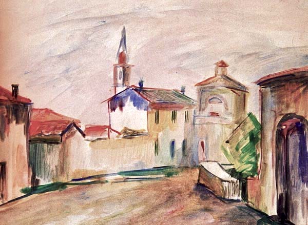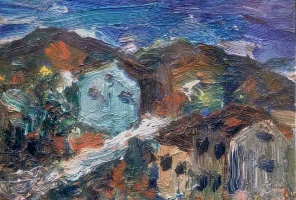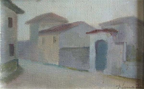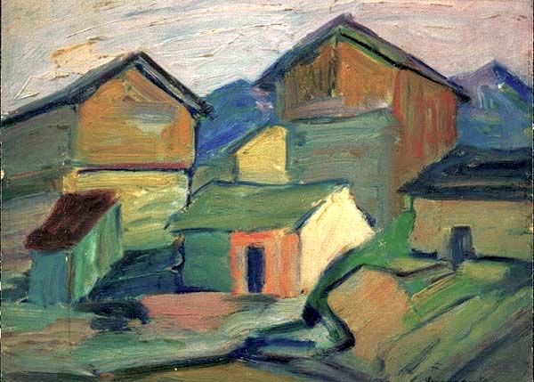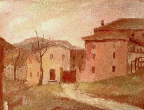 Sullo sfondo, una nuda montagna piramidale color indaco, che risalta contro il crema della casa e il marroncino dei pascoli ; e, sopra di essa, un cielo azzurrino che rischiara la scena, ma senza illuminarla veramente; perché la scena è luminosa, ma di una luce diffusa e senza sole – come, appunto, nelle giornate autunnali in montagna. Le superfici di colore sono relativamente uniformi; l’aria è nitida; i contorni degli oggetti – la strada, le due case, la montagna dominante – sono netti, senza sfumature. L’intera scena ha la dolcezza malinconica e l’estatico raccoglimento di un’abbazia immersa nel silenzio: è una scena religiosa nella sua francescana, disadorna bellezza e nel senso di accettazione della vita che è proprio degli spiriti umili. La si direbbe la traduzione sulla tela dei canoni della “poesia onesta” di Umberto Saba: pittura di verità, che non vuole abbellire le cose, perché esse possiedono già una soavità intrinseca e inconsapevole, come quella di una fanciulletta che non sa ancora di essere bella.