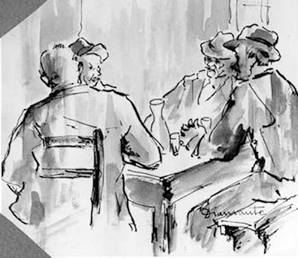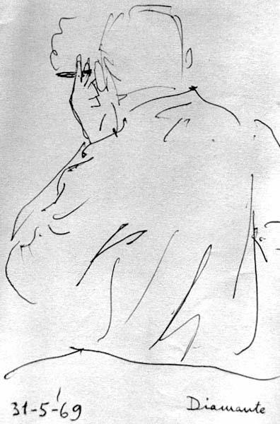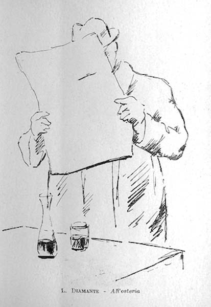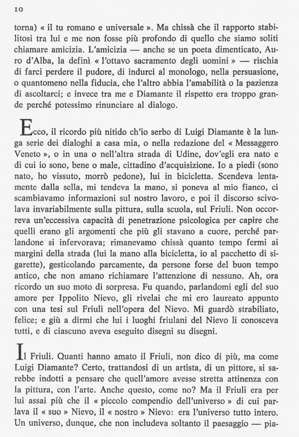 Cetancj sono i fats che mi fasin pensâ a Luîs Diamante? Magari cussì no indi è masse par che di un mac di fîi cussì penç e cence numar o rivi a olmâ un cjaveç che al sedi il plui significatîf, il plui just (…). Ve mo, il ricuart plui clâr che o ai di Luîs Diamante e je la schirie lungje di cjacaradis fatis in cjase mê o inte redazion dal “Messaggero Veneto”, o par cualchi strade di Udin, dulà che lui al jere nassût e che ancje io, ben o mâl, o soi deventât citadin raventât. Jo a pît (o soi nassût, o ai vivût e o murirai pidon), lui in biciclete. Al dismontave biel planc de sente, mi slungjave la man, si meteve in bande di me e si passavisi informazions sul nestri lavôr. Po il discors al leve a finîle dal infalibil su la piture, su la scuele, sul Friûl. Nol coventave sei grancj esperts di psicologjie par rivâ a capî che a jerin chei ju argoments che i stavin tal cûr, parcè che cjacarantint si infogave; si restave cuissà cetant timp fers sul ôr de strade (lui tignint salt il manuvri de sô biciclete e jo la mê scjatule dai spagnolets), judant il discors ancje cu lis mans, ma no plui di tant, salacôr tant che chei di une volte, che no i tignivin a dâ masse tal voli. Ah, cumò mi soven di un so moment di maravee. Al fo cuant che cjacarantmi de sô passion par Ipuelit Nievo, jo i palesai che mi vevi indotorât propit fasint une tesi che e rivuardave l’opare dal Nievo sul Friûl. Mi fissà dut sberlufît, contenton; e al tacà a dîmi che lui al veve a man ducj i lûcs furlans dal Nievo, e che di ognidun al veve fat sdrumis di disegns.
