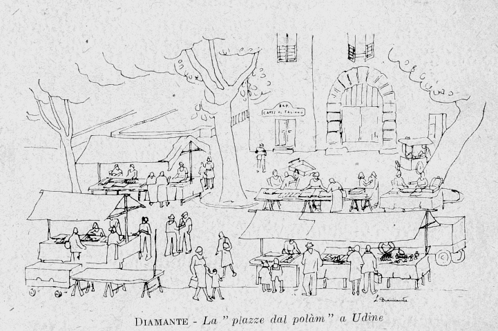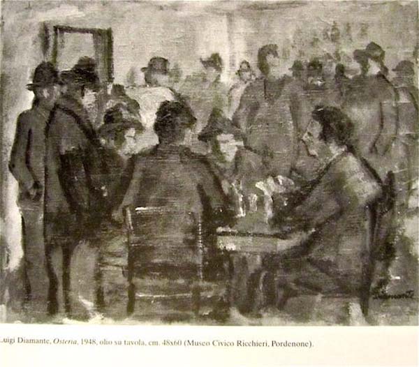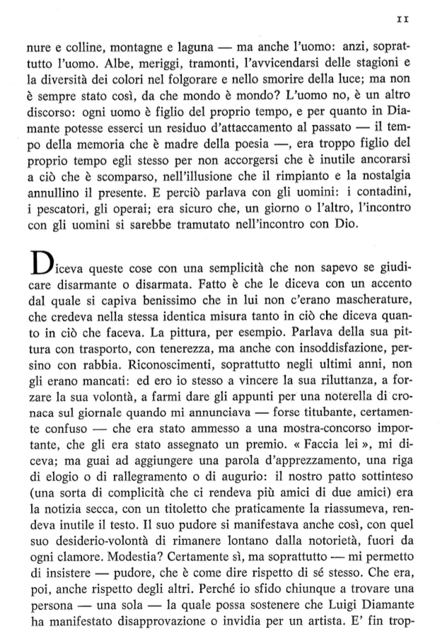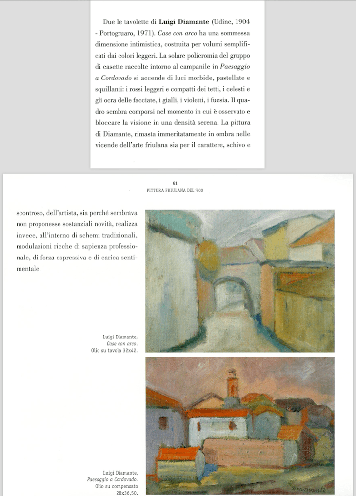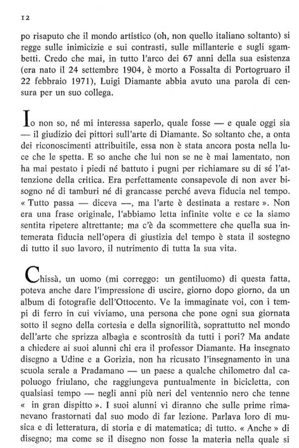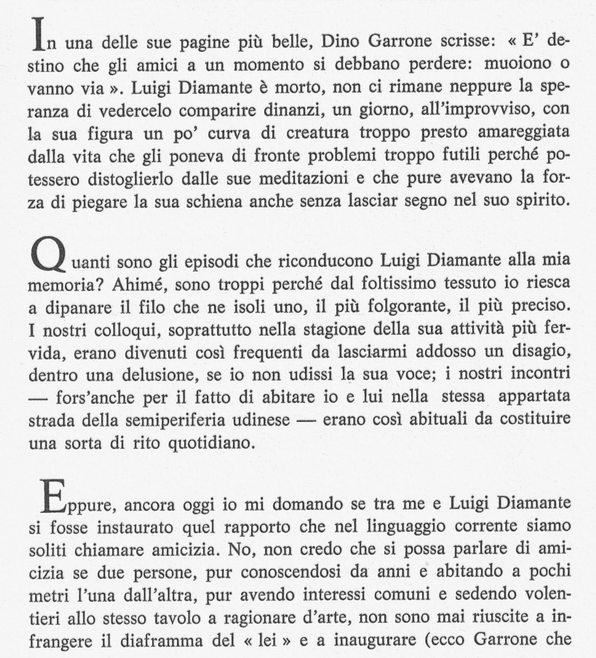Il Friûl. Cetancj ano volût ben al Friûl, no pretint di plui, tant che i à volût Luîs Diamante? Sigûr, stant che si trate di un artist, di un pitôr, si sarès menâts a pensâ che chel amôr al fos leât a strent cu la piture, cu l’art. Cemût no? Al è vêr ancje chest. Ma par lui il Friûl al jere une vore di plui che no un «piçul struc dal univiers» che indi cjacarave il “so” Nievo, il “nestri” Nievo: al jere l’univiers intîr. Un univiers, duncje, che nol cjapave dentri dome il paisaç – planuris, cuelinis, monts e marinis – ma ancje l’om: anzit, massimementri l’om. Albis, misdìs, amonts, il dâsi la volte des sesons e la varietât dai colôrs intal sflandorâ e intal smavidîsi de lûs; ma no isal simpri stât cussì, di cuant che al è mont? (…). Al cjacarave de sô piture come cjapât, cun passion, cun afiet, ma ancje cun malcontentece, parfin cun rabie. Ricognossiments, massime intai ultins agns, no i vevin mancjât: o scugnivi jo vinci la sô contrarietât, fâi cuintri a la sô volontât par fâmi dâ aponts par podê meti cualchi note di croniche sul sfuei cuant che mi spiave – salacôr cun esitance, di sigûr ingusît – che al jere stât acetât a fâ une mostre-concors impuartante, che i vevin dât un premi. «Ch’al fasi lui», mi diseve; ma no vevi di zontâ nancje une peraule di preseament, no une rie di laut o di indalegrament o di auguri: daûr dal nestri pat no dit e no scrit (une fate di complicitât che nus faseve sei plui che no doi amîs), e veve di sei une notizie secje e sclete, cuntun titulut che al jere in pratiche il struc dal scrit, che al faseve deventâ in sostance inutil il test. Il so pudôr si pandeve ancje cussì, cun chê sô brame e voie di restâ lontan de notorietât, fûr di ogni scjas. Modestie? Sì, di sigûr, ma massime – mi permet di insisti – pudôr, che al è tant che dî rispiet di se, che po al jere ancje rispiet par chei altris. Parcè che jo o sfidi cuisisedi a cjatâ fûr un – dome un – che al puedi contindi che Luîs Diamante al vedi palesât blasim o invidie par un artist. Lu san ducj che il mont artistic (e no dome chel talian) si ten sù sore des inimiciziis e sui cavii, su lis svantariis e su lis gjambadoriis. O crôt che mai, in dut il timp dai 67 agns de sô vite (al jere nassût ai 24 di Setembar dal 1904, e muart a Fossalte di Puart ai 22 di Fevrâr dal 1971), Luîs Diamante nol vedi mai vût une peraule di censure par un so coleghe (…).