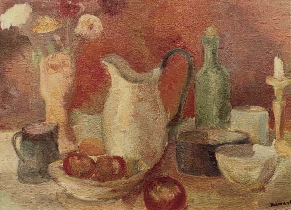 Solitario anche come pittore, non si legò a movimenti e a correnti. Negli anni dai ’30 ai ’50 la pittura di Diamante, familiare ed intimistica, si esprime con colori chiari, contrappuntati da ombre risentite con gusto quasi ancora ottocentesco; ma il tutto emana una pulizia ed una felicità visionaria che era semplicità gioiosa di sentire. Nel dopoguerra, le sue opere ad olio, tempera ed acquerello nascono con un senso del colore più materico, che comincia a prevalere sul disegno; Diamante, pur continuando ad esprimersi nella grafica sempre da grandissimo disegnatore, si avvia verso una composizione che viene costruita dal colore stesso. La luce viene bloccata in una densità di colore sugosa, tutta crepiti e arricciamenti, come si vede in certi paesaggi friulani. Ma c’è ancora serenità e contemplazione gioiosa della natura e della vita.