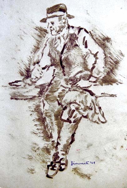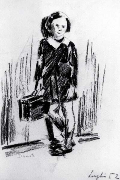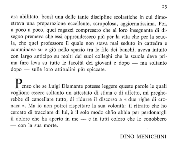 Un uomo piccolo e magro entra nella classe, in un silenzio che si potrebbe tagliare col coltello. Ha la barba mal rasata, indossa una giacca di lana sportiva e i suoi occhi brillano di una luce penetrante, mobilissima. Non certo giovane – ha più di sessant’anni – si muove a scatti, con una nervosa agilità, come se il tempo non gli pesasse minimamente. Nei banchi, i ragazzi trattengono il fiato: lo stimano, ma ne hanno anche un sacro terrore. Le sue sfuriate sono memorabili. È il professore di disegno, Luigi Diamante: un pittore che ha fatto dell’arte la sua ragione di vita e che vorrebbe trasmettere loro almeno un po’ di quel sacro fuoco indomabile, che lo consuma. Chi, come lo scrivente, ha avuto il privilegio di trovarsi seduto su quei banchi, e di farsi piccolo, come tutti gli altri, quando il professor Diamante si accingeva a interrogare qualcuno, non ha più dimenticato i suoi modi, la sua voce, la sua genialità, la sua lezione di vita.